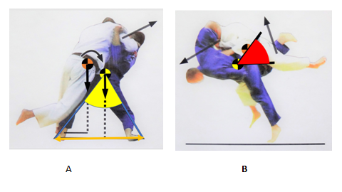 Figure 3In judo attacking competitor during the preparatory move (A) should maintain balance position with feet far apart (orange arrow) obtaining substantial equilibrium angle (yellow) and just before the throw should lower his body and get below opponent’s body (B) obtaining substantial attacking angle (red); black vertical vectors – gravity force, black oblique vectors – activity of muscle force.15