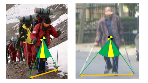During walking a vertical projection on the ground of body center of mass is presented often together with center of pressure (COP). These two points draw during straight walking a sinusoidal line (in mediolateral direction) with higher amplitude of COP. During walking or running COP jumps from one foot to another, while center of mass keeps a space between two feet. If a person would accidentally stop he or she would fall down. Sinusoidal track of center of mass is present also in vertical dimension. It is usually fewcm.16 But when disabled person is taken into account where he or she suffered disability in lower extremities and walks very slowly, even about 0.5m/s (during normal walking velocity of about 1.5 m/s is achieved) vertical oscillation of center of mass is very small, about 1-2cm and mediolateral oscillation is about 6cm.17 When dash running is taken into account vertical oscillation of center of mass for sprint running is about 10cm and for long distance running just few cm. For hurdle running center of mass is raised about 40cm above the obstacle. When lower raising of center of mass exists then less energy is needed for clearing the obstacle. Similarly is in high jump and especially in pole vault. When a body is substantially curved over the bar and upper extremities are over the head then while a body clears over the bar a center of mass can go near or a little bit below the bar. But here a body needs to go very close to the bar. Some people say that during a high jump when a body is well curved center of mass goes deep below the bar. But Kowalczyk18 in his dissertation proved this is untrue. Among 30 high jumpers of international level investigated only once center of mass went a little bit below the bar because a jumper hit the bar. It did not fell down and a jump was accepted. In specific situations like narrow mountain track, or in the case of disease of osteo-muscular or nervous system, using additional equipment like sticks or crutches is very helpful. For analysis of those kinds of locomotion center of mass is used for drawing of angles of equilibrium and for comparison of them without and with using special equipment (Figure 4). During the movement along the curve projection of center of mass can go beyond area of equilibrium. This happens during sprint running, bicycle riding, alpine skiing when competitor makes a turn. In this situation centrifugal force can be of high amount and a runner or rider can lean his or her body to the side. Resultant force of gravity force and centrifugal force should be directed to the place where the body or equipment touches the ground.