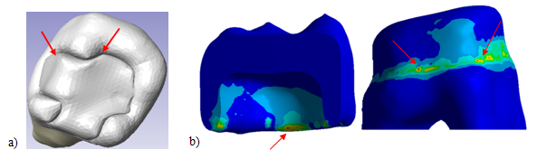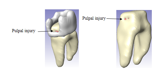 With biomodels, it is possible to find different agents without direct intervention. In figure 1, the findings found were not visible with an x-ray or the tomography with the naked eye, since the restoration and the enamel itself did not allow its visualization. The biomodel allows manipulation to virtually remove the restoration and the enamel itself. Likewise, it allows to establish the prognosis of the treatments. In Figure 2, through the biomodel, the critical points of a restoration can be observed due to lack of sealing and adjustment. With this, it is possible to intervene before ending the treatment and give a better prognosis, as well as providing a successful treatment. The numerical analyzes will contribute to the prediction of the aforementioned critical zones (Figure 2).