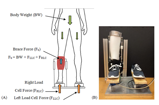 Testing performed in static double stance with each foot positioned on top of a single load cell. A custom program recorded load cell readings over a specified period. At the start of each test, approximately five seconds of load data collected without brace activation. The pneumatic cylinders activated to a specific pressure to create a bracing force, and testing continued for twenty seconds. The pneumatic cylinders were inflated to five different pressures: 40, 50, 60, 70, and 80 PSI and tested ten times at each level. Brace force (Fb) calculated for each run by taking the user’s bodyweight (BW), or the sum of the readings of the left load cell force (FLLC) and of the right load cell force (FRLC) before brace activation and subtracting out the sum of the two load cell readings after brace activation. Brace Efficiency, or how well DAO transferred offloading forces to the limb, was calculated using the brace force (Fb) of the DAO and total cylinder force provided by pneumatic cylinders in the first part of this experiment.