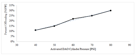 The amount of force that the DAO relieved expressed as a percentage of bodyweight BW, ranged from 11.3% at 40PSI to 30.5% at 80PSI. It is currently unknown what amount of force relief at the ankle is clinically relevant, but through conversation with two orthotists, two general goals set for the DAO. First, the DAO should provide axial unloading without compromising circulation or soft tissue integrity. The medical literature shows that during noninvasive ankle distraction no nerve damage was seen when tested up to 135 N for 1 hour.10 This is not directly applicable as this experiment performed on an unloaded ankle (i.e., non-weight bearing) and the ankle would be under load with the DAO, but it still gave a reference of what was safe without causing nerve damage in an unloaded ankle. Second, a goal of at least 10% of bodyweight of force relief at the braced ankle set as a mark of potential clinical efficacy. This test shows the ability of the DAO to provide offloading of the ankle. The DAO provided up to 148N of brace force Fb to the user which amounted to 30.5% of body weight. The DAO was also able to transfer cylinder force output to brace force Fb at an 83-95% effectiveness rate. The DAO, therefore, accomplished both design goals set by the Orthotists.