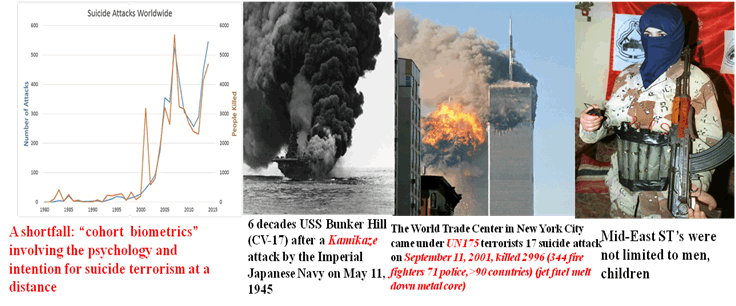 We wish to apply AI ANN machine learning to detect ahead of time Suicidal Terrorists. The complexity of such a subtle emotional response forms a class of cohort biometrics involving IQ, e-IQ, culture, religion, belief. Biologically, we assert that relatively retarded Hippocampus for associative memory IQ and small Amygdale sizes for low social skill e-IQ that might attribute to the Suicidal Terrorist behavior. Smartphone, Day and Night Video (Short Wave Infrared (SWIR) 0.8-1 micron Digital Video Imaging Camera are indicated in (Figures 1-3)