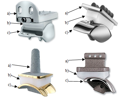Figure 1 Different types of prosthesis for the ankle joint4 and different components; a) Tibial component. b) UHMW-PE insert. c) Astragaline component.