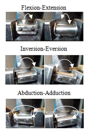 The main disadvantage of these devices is that, by now, their expected life time remains undetermined and as a consequence the patients using these artificial attachments should recur to constant and repetitive surgical interventions to solve this problem.4,5 Therefore, for the especial case of an ankle joint prosthesis, it was proposed to develop a self-driven mechanism to apply the loading cycling conditions to the ankle joint. The main objective of this device to perform cycle slide wear test on different prosthesis, simulating the surface contact under loading conditions and considering the surface relative motion. Therefore, by using such a mechanism (Figure 2)6 designed at the Instituto Politécnico Nacional, slip wear endoprosthesis test can be carried out in such a way as to determine the lifetime of these elements. The device designed in Figure 2 allows all the simulation of gait and is able to reproduce the movements of ankle join while it moves under: Flexion– Extension, Inversion–Eversion and Abduction – Adduction (Figure 3). Additionally, the mechanism can be programmed to work under accelerated cycling conditions in order to produce wear in a shorter time.