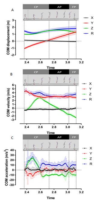 Figure 1 Body COM kinematical parameters during Jump throwing phases: (A) displacement (X, Y, Z, R); (B) velocity (X, Y, Z, R); (C) acceleration (X, Y, Z, R).