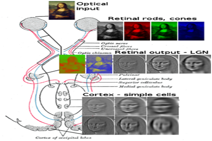 The human visual system (HVS) is the part of the central nervous system which gives human the ability to process visual detail. It detects and interprets information from visible color light to dark light build a gray scale representation of the surrounding environment. The visual system carries out a number of complex tasks, including the reception of light and the formation of monocular representations; the buildup of a binocular stereo perception from a pair of two eyes; assessing distances to and between objects; and guiding body movements in relation to the objects seen (Figure 1). In order to illustrate the self-assembly capability, Szu et al.1 considered experimentally a laser imaging experiment on a wet film that is made of bacteria rhodopsin (BR) molecules suspended in a diffusion-limited viscous medium.2,3 The 1981 Nobel Laureates in Physiology went to both Harvard Prof. David Hubel (passed away at 87 due to kidney failure) & Johns Hopkins Prof. Torsten Wiesel (8 years’ President of Rockefeller Univ 94 alive).4 Together they have discovered the simple cells for bars and complex cells for cross of cat vision. These open up the microscopic vision. It furthermore suggested the on-the-center and off the surround, so-called Mexican hat wavelet for multiple resolution analysis at feature extraction (cf. Sir John Daugman) at the retinal output. Then, the pathway of optical information is relayed through the Lateral Geniculate Nucleus (LGN) in the thalamus to the back of the head, cortex 17 area, with V1~V4 layers respectively give the color, edge, contour extraction Figure 1 picture is conveniently taken from Wikipedia; the explanation is synthesized from the open literature (Figure 2).