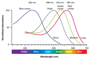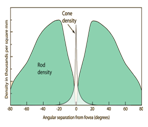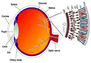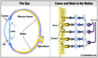 Figure 1 Human monocular and binocular visions begin with both eye optical lens and retina fovea where 6.5 million RGB color cones and 150 million dark light gray scale rods are distributed per eye. Each cone sensor has a nerve, and 100 rods are bundled together with at Ganglion integrator and the pass single nerve to back of the head.
