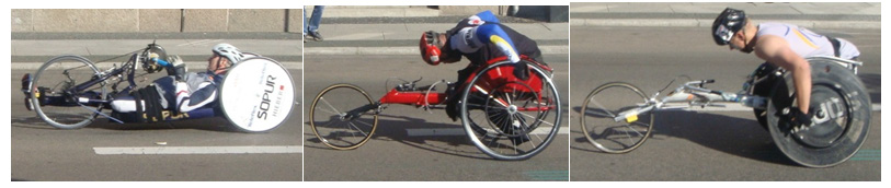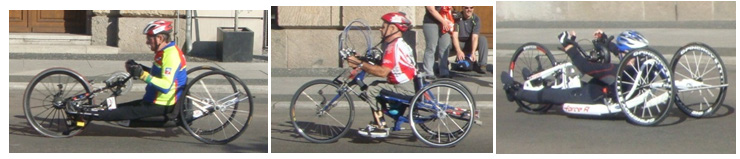 The oldest equipment for competitive sport for disabled athletes was wheelchairs used on the track. They were used at first in 1948 when Sir Ludwig Gutmann organized Stoke Mandeville Games, which evolved into the modern Paralympic Games.27 In the following years wheelchairs were used in several other sport disciplines, like: different ball games, hockey, fencing, and weightlifting. Then many other designs appeared: handbikes, running prostheses, sleds, even exoskeletons. They are of different levels of assistive technology: a) simple, b) low tech, c) advanced technology, d) computerized technology. Today handbikes are of many different designs. There are handbikes for people with existing but paralyzed lower extremities Figure 5 and for people without lower extremities (Figure 6). Very popular among disabled athletes who lost their lower extremities are specially designed prosthetic devices. There are different types of these devices used for running, climbing, cycling, skiing (Figure 7).