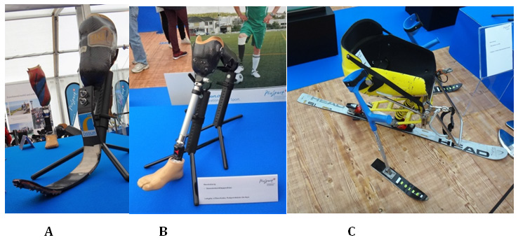 Figure 7 Prosthetic devices which substitute parts of lower extremities for: (A) running and jumping; (B) football; (C) skiing