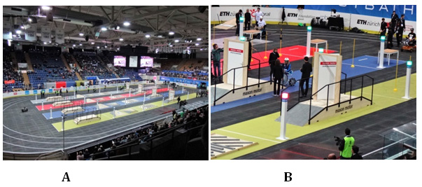 Figure 8 Cybathlon 2016: (A) general view of the sporthall in Zurich-Kloten; (B) wheelchair competitor on the track with obstacles.