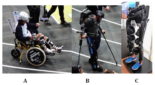 There was and still is a controversy whether disabled athletes can participate within the competition together with able-bodied athletes. Unfortunately runners who use carbon fiber prostheses are in favor since their device returns much higher amount of energy than do a foot of able-bodied runners.28 In addition these light prostheses have much lower moment of inertia giving much lower resistance to the propelling muscles.29 Very special sport equipment represents ReWalk Robotic Exoskeleton (ReWalk Personal System) built by Argo Medical Technologies. This device was designed especially for people with tetraplegia. This exoskeleton is a wearable robotic exoskeleton that provides powered hip and knee motion to enable individuals with spinal cord injury to stand upright, walk, turn and climb and descend stairs.30 It works based on feedback from the state of the patient’s extremities. Steering is done from the pilot worn on the wrist and keys mounted on the crouches. Energy is supplied from the battery carried within the backpack. It can operate through the whole day. In 2012 Claire Lomas (UK) walked using a ReWalk the distance of the marathon (42195m) in 17 days. In 2016 Swiss Federal Technical University in Zurich organized the first competition for people with disabilities, who, supported by the latest assistant systems in various disciplines, competed against each other and solve everyday tasks (Figure 8). There were the following disciplines where robotic assistive devices were used:31 1) powered wheelchairs, 2) cycling with electrical muscle stimulation, 3) exoskeletons, 4) powered upper extremity (arm) prostheses, 5) powered lower extremity (leg) prostheses, 6) brain-computer interface race (Figure 9).