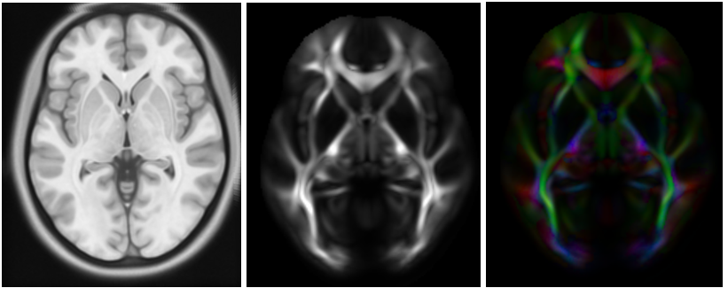 Figure 1 Axial representation of the DT MRI processing pipeline. (a) A T1 weighted image is used as a reference image, (b) FA is computed using multiple diffusion weighted images, and (c) a DEC map is created, where colors indicate fiber orientation.