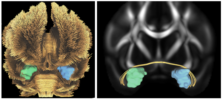 Figure 2 Frontal coronal view of fiber tractography generated using DSI Studio from the Human Connectome project DT MRI data. (a) Full brain fiber tractography with right (green) and left (blue) amygdala shown inside, and (b) Amygdala specific fiber connectivity isolated with FA in the background.