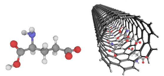 Figure 3 Molecular dynamics rendering software can realistically simulate molecular interactions from (a) A single glutamate molecule, to (b) a collection of glutamate traveling along a ‘fiber’ (carbon nanotube).