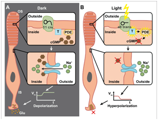 Figure 6 Rod cell under the influence of dark current (left) and in normal daylight conditions (right). Dark current mechanism constantly releases glutamate, while light conditions inhibit release.14
