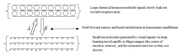 We assume a two time scale perturbation model of which the relaxation time are inversely proportional to the sizes of hormone senders and their receptors. Larger receptors would have an easier ability to capture the hormone messengers. Our model resembles the Adaptive Resonance Theory (ART) unsupervised learning model.23 and facilitates the homeostasis principle among two block networks: (1) the lower block nodes represent a sensory processing ‘committee’, i.e., a sensory decision involving vision and hearing as well as intuition about a predator concealed in the environment and (2) top block nodes serve as the ‘messengers’ i.e., the adrenal gland located above the kidney will secrete the adrenaline hormone which propagates through blood vessels with oxygen other nutrients to limb muscles to be ready for a “fight or flight” response. Together, the decision must operate at the homeostasis Helmholtz Principle at an effortless MFE. Collectively, the bottom block voting represented by the net sensory vector spanned by a ‘committee’ of all sensory input vectors and top block voting presented the total action vector among ‘managers’ decision vectors shown below in Figure 7.