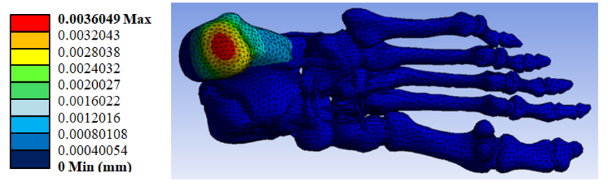 A 3D model of the human foot bones was previously reconstructed from medical imaging data and prepared for finite element analysis in ANSYS Workbench. The model included cortical and trabecular bone regions segmented from CT datasets, smoothed and meshed with tetrahedral elements to ensure adequate convergence and stability of the solution. Mesh quality was verified through element aspect ratio and orthogonality criteria to minimize numerical error.