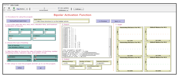 Programmer can choose any interesting agents shapes to design the agent based modelling, and some interface builders like buttons, sliders, switches, choosers, monitors, notes, output area in the agent based modelling can be developed too. Those interface builders are ready to use and programmer do not need to write more programming language from them. A simulator of Hopfield networks that use a conventional computer had created but not for building up a new network design every time or to store a new set of memories. Hence, Netlogo saves lots of energies and times for the programmer to rebuild new system from time to time. Thus, a computer program which emulates exactly what the user want needs to construct in order to simulate the action of Hopfield Network. It is easier for the programmer to modify the program and store a new set of data. Thus, an agent based modelling had designed for the user to run the simulator. Moreover, agent based Modelling which also called individual-based modelling is a new computational modelling paradigm which is an analyzing systems that representing the agents that involving and simulating of their interactions. Their attributes and behaviours will be group together through their interactions to become a scale. Programmer can design ABM in Netlogo by using button, input, output, slides and other functions that make ABM easy to understand and use. In addition, ABM reveals the appearance of the systems from low to high level outcomes and it make improvement by surpassing the traditional modelling limitations such as allowing agent learning and adaption, limited knowledge and access to information. This is because, the agent based modelling paradigm are commonly used in dynamics and complex communities such as telecommunication, health care and others that involving large populations which used explicitly capture social networks. In this section the steps involved in developing ABM for the logic programming method will be considered. Firstly, look into the steps involved in developing for activation functions to do logic programming in Hopfield Network as Figure 4 below: