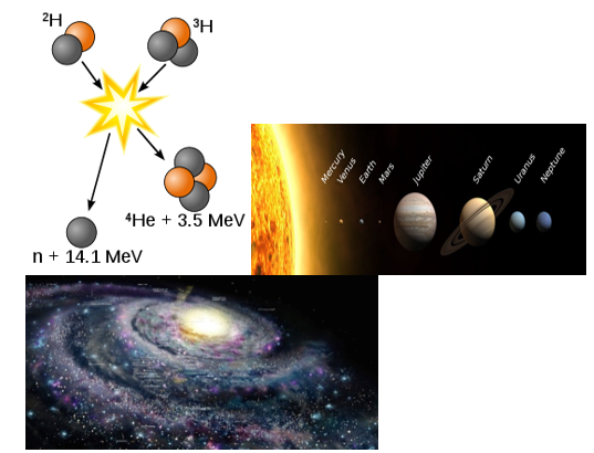Figure 1 (a) Power of Sun from the fusion 2 hydrogen’s (1Proton, 1 Neutron) into Helium with excess mass and E=mC^2 (2 protons 2 neutrons); (b) Sun(left), 8 planets: Mercury, Venus, Earth (& moon), Mars, Jupiter, Saturn, Uranus, Neptune (as well as dwarf Planet Pluto; and other comet, meteorites. (c) Milky Way Not in scale1