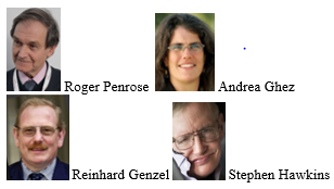 Figure 2 Nobel Laureates in Physics 2020 for proven and measured two colliding Black Holes in the Center of Milky Way. (a) Roger Penrose (Oxford); (b) Andrea Ghez (UCLA), and (c) Reinhard Genzel (Max-Planck). (d) Late Stephen Hawkins suggested light fluctuation quantum effect might make a smaller black hole be easily detectable.