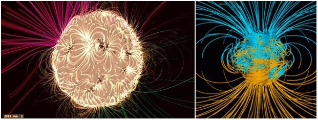 Figure 3 (a) Sun Magnetic field (NASA GSFC, 2013 June 1) simulated (b) the Earth Magnetic Field (noaa.gov); The specialty of the Earth is due to (i) the size of the Earth which is bigger than the Mars and the Earth satellite moon, and (ii) the location of the Earth which is close enough to the Sun to inherit the further fusion.