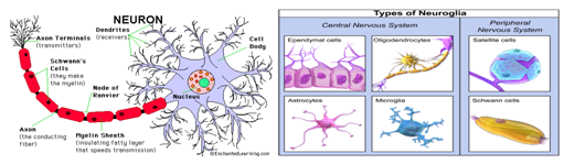 Figure 2 6 kinds of Active Glial Cells: Some Glial Cells (Schwann cells) are surrounding the Axon neuron known as "Myelin Sheath" insulating fatty layer that speeds transmission (keeping the output repulsive positive ion vesicles align up in the axon pipe, like ducks cross the road, so that one pushes in, the other pushes out in pseudo-real time). House-Keeping Servant Cells have 4 kinds. They are electrically insulated Glial Cells to keep those positive ions line-up within communication Axon channel: Astrocytes, Oligodendrocytes, Ependymal Cells, Microglia, in Central Nervous System, 2 kinds Satellite cells and Schwann cells in Peripheral Nerve System. Albert Einstein has 10 billion neurons; but 100 billion Glial cells that are charge neutral and missed in the first cut conducting measurement. During 8 hour good night sleep, the brain produces much less physiological by-products and the brain wave calms down to the delta waves (5~10Hz). There are about 100 billion Glial cells (Astrocytes: Latin: star-shape) that can haul energy byproduct other physiology trash produced by billions neurons and also dead neurons about 10 times in the size through the lymph blood capillary system toward the liver for purification & recycling. One cannot help but question an general design question why brain has to piggy back the liver by going through the trouble of a long distance passage through the neck and spinal cord to the liver. Why do we not doing the similar thing like liver directly at the end of brain stem? Of course, we understand the rest of body also produce energy by-product about 80% that requires the liver to purify the blood