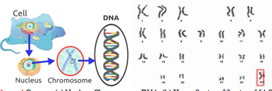 Figure 4 Genome (a) Nucleus Chromosome, DNA; (b) Homo Sapiens 32 pairs of 64 Chromosome un-winded in a total 3 meters long or the total statistics led to Human Genome Program. Realizing the significance to biostatistics of BB mental diseases in 1988, the National Research Council recommended a national concerted program to map the whole human genome in 10 to 15 years. Given the gene is not enough, it is often the transcript from the gene might suffer errors