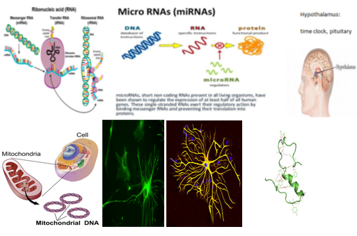 Figure 12 Mitochondria cells: within our cell as co-evolution partner in power generation. Mitochondria convert ATP-ADP energy to support multi-cellular organism. The Weakest link of brain neurophysiology is the Astrocytes Glial Cells are part of Central Nerves System (CNS) with 4 kinds of Glial cells as the house-keeping servant cells. They get their name because they are "star-shaped". They are the most abundant Glial cells in the brain that are closely associated with neuronal synapses. They regulate the transmission of electrical impulses within the brain. Metabolic support: They provide neurons with nutrients such as lactate. [Image courtesy of EnCor Biotechnology Inc. An Astrocytic cell from rat brain grown in tissue culture and stained with antibodies to GFAP (red) and vimentin (green). Both proteins are present in large amounts in the intermediate filaments of this cell, so the cell appears yellow. Visualization of individual DNA molecules in solution by light microscopy: DAPI [4,6-Diamidino-2-phenylindole] staining method developed to visualize individual DNA molecules in solution under a fluorescent microscope connected to a highly sensitive video camera. The blue material shows DNA visualized with DAPI stain, and reveals the nuclei of the Astrocyte and other cells]; Cause of Dementia Amyloid beta peptide (beta-APP) A partially folded structure of Amyloid beta(1 40) in an aqueous environment (pdb 2lfm). A recent study suggested that APP and its Amyloid potential is of ancient origins, dating as far back as early deuterostomes. The normal function of Aβ is not well understood. Though some animal studies have shown that the absence of Aβ does not lead to any obvious loss of physiological function, several potential activities have been discovered for Aβ, including activation of kinas enzymes, protection against oxidative stress, regulation of cholesterol transport, functioning as a transcription factor, and anti-microbial activity (potentially associated with Aβ's pro-inflammatory activity).