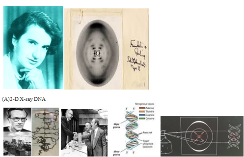 Figure 13 A1 (A) 2-D X-ray Pictures by Rosalind Franklin, King's College of London four years after Franklin's death at age 37 from ovarian cancer, versus (B) 3-D DNA model C(cytosine)-G(guanine), A(adenine)-T(thymine) by Maurice Wilkins, James Watson and Francis Crick received a Nobel Prize in 1962 for the double-helix model of DNA.