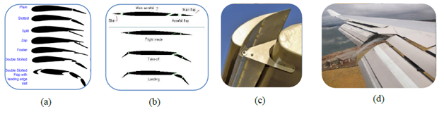 Slats and flaps are high lift devices, intended to produce maximum lift coefficients on aerodynamically designed wings of aircraft. The use of aerodynamic extensions are done in order to increase the effective plan form area of wing thereby generating extra lift force required for an aircraft wing. A typical passenger aircraft has three stages in a flight during which the high lift devices are deployed and retracted when required. From Figure 1A, there are seven types of extensions. The first one known as plain flap is attached to trailing edge; second one is slotted flap and has cove in the aft region of main element. A split flap is integrated into the main element and activated by means of a lever near the trailing edge. A zap flap is similar to a split flap but operates using a hinged kinematic mechanism present at the main element along with a crank and lever actuator to retract and deploy when required. The most frequently used flap in aircraft is Fowler flap which forms a unique combination with main element, since it operates using a servo mechanism with a transverse beam support along the wing span. Hence to increase the lift coefficient, the no of slots can be added in order two or three and arranged in tandem at the trailing edge of aerofoil. This is done to augment maximum lift coefficient at a given angle of attack and to enable the lateral stability of aircraft during rolling manoeuvre.1