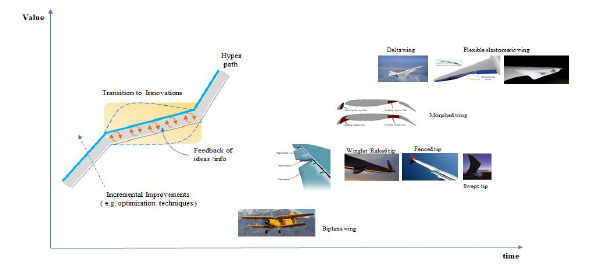 Figure 2 (A) Roadmap for innovation cycle (adapted from)4 (B) Illustration of aircraft wing innovations.