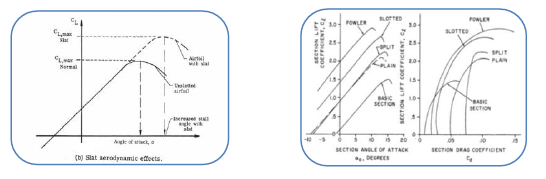 The aircraft wing experiences a turbulent boundary layer flow over its surface, caused due to velocity or pressure fluctuations and responsible for generation of lift. The amount of lift produced varies with geometry parameters of aerofoil and depend on three key variables viz. gap distance,2 overhang length and deflection angle3 of flap and slat devices integrated to main aerofoil. The deployment of flap and slat configurations to main aerofoil is done for the take-off stage partially since velocity of aircraft is low. The high lift and low drag action produced as result also helps to increase the pay load capacity or take-off weight of an aircraft. For smooth landing conditions the aircraft must again slow before the touch down on runway for which the trailing edge flap devices are deployed to produce high lift and high drag on wing surface. This arrangement also allows the pilot to have a better visibility through nose up or nose down attitude of aircraft. The slat and flap combination produces a mechanism which effectively increases the camber and total wing area distributed along wing span. From Figure 3A slat contribution to lift augmentation at a given angle of attack is significant and increases the maximum CL or L/D ratio by 10-15%. Presence of leading edge slat delays the boundary layer flow separation and stall over main aerofoil. Further, it improves the flow control by proper mixing of mass, increase the momentum of air stream and also reduce the flow induced noise. Figure 3B shows the sectional lift coefficient comparison for plain and slotted wings. The maximum CL of 3 is obtained for wing using a fowler flap with ~35% improvement.