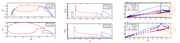 Figure 5 (A) Geometry of 30P-30N and GAW-1 aerofoils (B) Pressure coefficient, Cp distribution using 2D viscous panel method for 30P-30N and GAW-1 aerofoils at 60 angle of attack (AOA) and Reynolds number (Re) of 6.2 x105, M-0.095 (C) Illustration of chord Reynolds number and turbulent boundary layer thickness, δ in m, on main element for 30P-30N and GAW-1 aerofoils at 60 AOA using 2D viscous panel method.