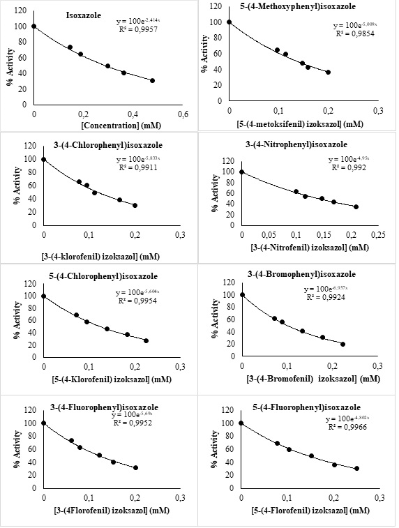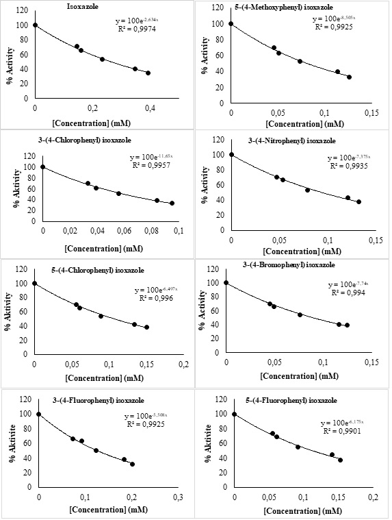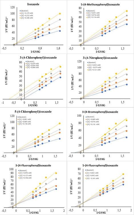 For GR enzyme, IC50 values of isoxazole, 5-(4-methoxyphenyl) isoxazole, 3-(4-chlorophenyl) isoxazole, 3-(4-nitrophenyl) isoxazole, 5-(4-chlorophenyl) isoxazole, 3-(4-bromophenyl) isoxazole, 3-(4-fluorophenyl) isoxazole and 5-(4-fluorophenyl) isoxazole were found 0.263, 0.082, 0.059, 0.094, 0.107, 0.089, 0.126 and 0.112 mM respectively (Figure 3).