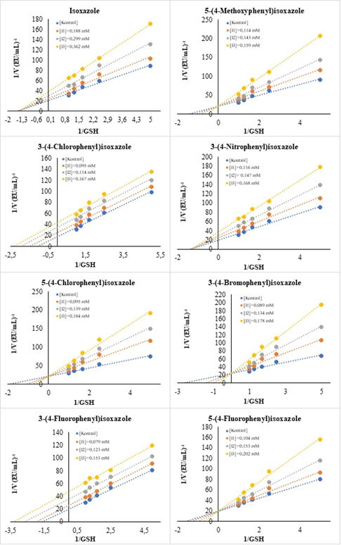 Measuring enzyme activity at different inhibitor concentrations allows researchers to identify compounds demonstrating inhibitory effects in the context of inhibition experiments. For isoxazole and its derivatives (Figure 1), %Activity-[I] graphs showing notable inhibitory effects were created. After that, IC50 values were computed using the equation that was obtained from the curve. Enzyme activity measurements at the concentration of isoxazole derivatives that lower GR and GST enzyme activity by half were carried out in order to ascertain the KI values of the compounds for which IC50 values were determined. To provide a thorough knowledge of the inhibitory effects, this was done in conjunction with measurements at five distinct substrate concentrations, both above and below this inhibitor concentration. Using the collected data, Lineweaver-Burk plots were produced for every inhibitor. These plots were used to infer the inhibition kinds, from which KI values were computed.20–27 This method made it possible to characterize the isoxazole derivatives inhibitory activity on the GR and GST enzymes in great detail, which shed light on the kinetics of interactions between inhibitors and enzymes