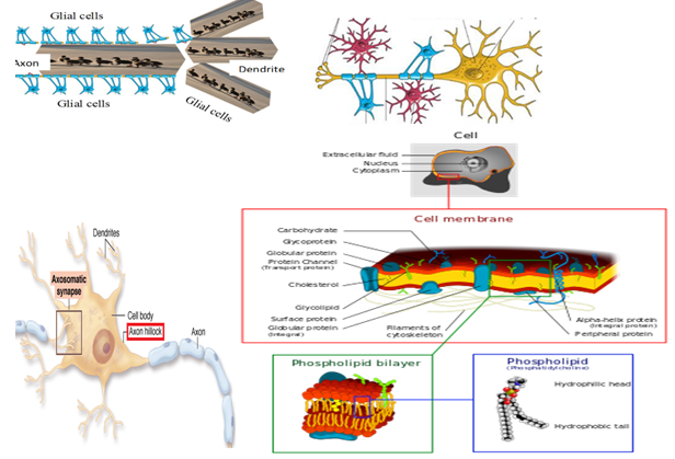 Figure 4Indicate the complexity of ion current reservoir that (Wikipedia) might go wrong. A single layer of the membrane is built with hydrophilic heads and hydrophobic tails (like a human heads and legs) in three inter-related inserts in the RHS. The potential at the Axon Hillock (LHS sub-figure) has about ~100–200 voltage-gated sodium channels per square micrometer. Both inhibitory postsynaptic potentials and excitatory postsynaptic potentials are summed in the axon hillock and once a triggering threshold is exceeded, an action potential propagates through the rest of the axon (and "backwards" towards the dendrites as seen in neural back-propagation).