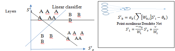 Figure 9 Artificial Neural Networks (ANN) needs multiple layers known as Deep Learning8,9 (a) Left panel shows that while a single layer of Artificial Neural Network can simply be a linear classifier, the right panel shows the dendrite net giving rise to the linear classifier equation after the sigmoid threshold.