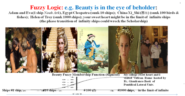 Review of fuzzy membership function, which is an open set and cannot be normalized as the probability but a possibility (Figure 10). UC Berkeley Prof. Lotfi Zadeh passed away at the age of 95 years old and Walter Freeman at age 89. To them, 80 may be “young.” Likewise, the “beauty” is in the eye of beholder. According to the Greek mythology of Helen of Troy, has sunk thousand ships, and Egypt Cleopatra hundred ships and Bible Eva one ship (Noah Arc) (Figure 11). Consequently, the car will drive through slowly when the red light happens at the mid night in desert and without incoming cars. Such an RB becomes flexible as EBES. To show that this replacing RB with EBES is a natural improvement of AI in the remaining paper. This explains a driverless car that will turn the rule stopping at red light to be gliding over the red light when no incoming car at mid light in desert.10–16