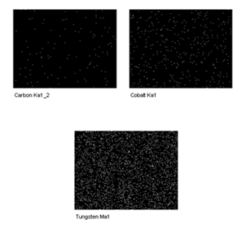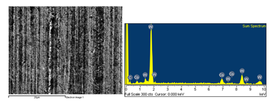Micropunch (Made by Ultrahardness tools company in Japan) with 75% volume fraction WC particle and 25% volume fraction Co particle of 50μm mean size, 150μm in diameter, is shown in Figure 1. Pure titanium sheet with 200μm in thickness was used as the substrate. Figure 2 shows the surface microtexture of micropunch and its elements’ (Carbon, Tungsten, Cobalt) distribution. Ploughs induced by the ultraprecise machining can be obviously detected, and some debris distribute on the surface of the micropunch. Moreover, the distribution of tungsten element is denser than that of both carbon element and cobalt element, which indicates the hardness of the surface of the micropunch is hard and suitable for the micro punching process.