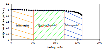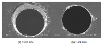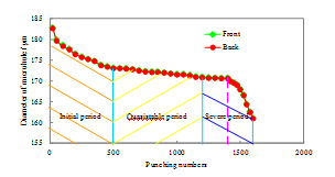 The LEXT confocal laser-OLS3000 was taken for measuring the morphology of the micropunched holes as shown in Figure 11. Figure 12 shows the relevant results (each for 5times) of the diameters of the punched microholes in the micropunching of both front side and back side. The wear loss of the punched microhole at various punching period is shown in Figure 13. It shows that the wear loss of the micropunch in the various periods is distinctive and the diameter of the punched microholes varies correspondingly. Also, the wear loss of the micropunches is consistent with the diameter variation of the microholes. Obvious decrease of the wear loss of the micropunch in the initial period is definitely detected with the apparent change of the diameter of the microhole. Interestingly, the attractive results of the variation of the diameter of the microhole are detected when the punching number ranges from 500 to 1200. In this period, the diameter of microhole is relatively kept stable due to the un-variation of the micropunch which indicates by the near zero weight loss of the micropunch in the quasistable period. While the micropunching increases further (i.e.>1525) as shown in Figure 12, the diameter of the microhole changes obviously. Meanwhile, the wear loss of the micropunches increases remarkably as a result of the serious loss of cobalt. Due to the lack of cobalt (which is taken as the bonding material with tungsten carbides), the tungsten carbides are easily peeled off. As a result, the diameter of the microholes and the wear loss of the micropunches vary seriously in the severe period of micropunching. Furthermore, with the micropunching process going further, due to the friction between the sample and the micropunch, the temperature of the micropunch will increase. Consequently, the particles of tungsten carbides are more easily peeled off due to the different thermal expansion coefficients of WC and Co. As a result, the wear loss of the micropunch is more intensive in the severe period. Moreover, if the feedrate of the micropunching increases, the more drastic wear loss of the micropunch will appear.