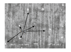The morphology of the punched microhole in the initial period (i.e. punching number <500) is shown in Figure 3. Some debris distribute on both sides of the microhole can be detected obviously, especially for the front side. The relevant EDX results are expressed in Figure 4. It indicates that on the front side, debris include the materials of the micropunch (W, Co, C) and the material of the substrate (Ti). It is worth to note that the elements such as Na, Cl, S and O are also detected due to the operating contamination in the micropunching. Moreover, the debris distributed on the back side is sparser than that of the front side. The microtexture of the surface of the micropunch during this period is shown in Figure 5 correspondingly. Compared Figure 5with Figure 2, it illustrates that the wear of micropunch in the initial is distinct. The ploughs in the surface of the micropunch become flat during the punching and the tracks of the initial ploughs only distribute sporadically on some areas. In addition, WC particles can hardly be detected. It reveals that the dominant factors of the wear loss in the initial period mainly due to Co loss and the debris distributed originally on the surface of the micropunch at the beginning as shown in Figure 2.