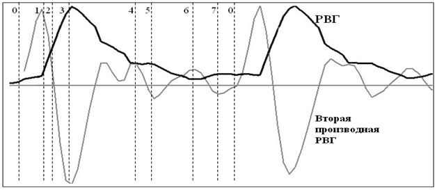 Figure 1 The phase structure of a large circle of blood circulation (rheogram of the upper limb and its second derivative).
