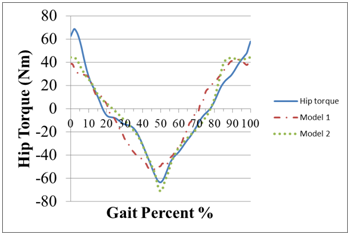 Figure 1 The hip torque for an 80 Kg participant is modeled using an impedance model (Model 1) and a phase based model (Model 2). The phase based model is able to better model the V-shaped torque profile. Biomechanics data from [11] is used to test the models.