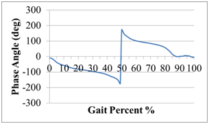 Figure 2 The hip phase angle as a function of gait percent. A scale factor of 2.09 is used which corresponds to 2*pi*0.333Hz.