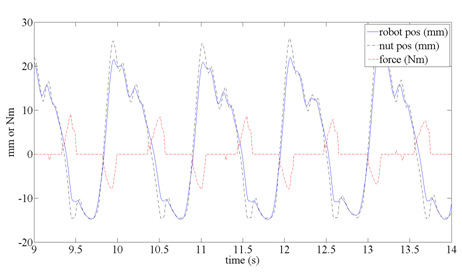 As the user walked, transitioned to running, and ran, a continuous assistive torque was applied based on equations 9 and 10. A constant scale factor was used in equation 10 to simplify the model. A constant offset angle of negative ten degrees was used based on experimental testing. An offset value in Table 1 of -81 degrees was too large and caused resistive forces. Although the values in equations 9 and 10 are different than parameters in Table 1, the same simple model was used to determine a torque command. Experimentally, the angular velocity is measured using a rate gyro and integrated to determine the angular position. A scale factor w is chosen and f is calculated at 500Hz. The torque command is then calculated using equation 9. The applied torque to the user is shown in Figure 3. It is calculated based on the deflection of a spring inside of the hip actuator. The compressed spring pushes on a lever-arm which applies torque to the hip strap. The actuator uses a brushless dc motor and belt drive to rotate a ball screw. The nut position on the ball screw is labeled “nut pos” and measures one side of the spring. The robot position is a measure of the lever arm position attached to the user’s thigh. The lever position measures the other side of the spring. The difference between the “nut pos” and the “robot pos” is the spring deflection which can be converted into a force. The assistive force is multiplied by the lever arm length to calculate an assistive torque in Nm. After weight acceptance, the motor applies a positive 9Nm of torque to extend the hip and assist in the stance phase. As the thigh is flexed during the swing phase, 8 Nm of torque is applied to lift the leg during the swing phase.