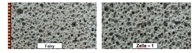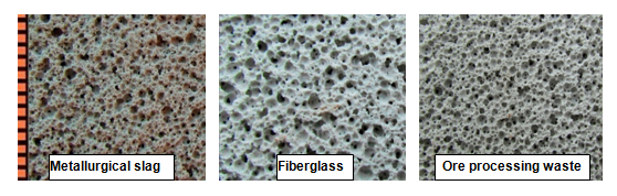 The effect of foaming agents of various origin on the porosity of alkali-containing solutions of NaOH (density 1200kg/m3), Na2CO3 (density 1200kg/m3) was investigated; Na2O(SiO2)n–liquid glass (density of 1250kg/m3). A liquid glass of density 1200–1350kg/m3 provides the required properties of foam and hardening material. The use of the protein foaming agent «Unipore» is accompanied by coagulation processes and the formation of clots in the liquid glass. Foam based on «Unipore» is heterogeneous and very unstable. The foam based on synthetic blowing agents «Fairy» and «Zelle –1» is stable, has small pores. Such foaming agents are most effective at pH =7.0–10.5. Liquid-glass compositions consist of liquid glass and technogenic filler, which affects the rheological properties and the foamability of the mass. As fillers are used: cullet, metallurgical slag, heat power ash, scrap waste from enrichment of skarn-magnetite ores. The increase in the proportion of the filler naturally increases the density of the compositions by decreasing the porosity. To obtain a foam-mass resistant to sedimentation, the ratio of «liquid glass: filler» should be considered equal to «1:1.65–1:1.85», the concentration of foaming agent is 3–4% (for example, Table 1). The structure of compositions with a density of 480–650kg/m3 is sensitive to a change in the material composition of the molding mass. Compared with «Fairy» when using «Zelle – 1» large cells with an average size of 0.–1.0 mm are formed (Figure 3). Foam concrete based on metallurgical slag and wastes of enrichment of skarn-magnetite ores is characterized by smaller cells in comparison with the cullet-based composite (Figure 4).