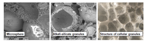 For the liquid-glass compositions porosity is used hydrogen peroxide by gas formation method. Injection of 1–5 % H2О2 provides a composition with a density of 770–960kg/m3. The pores are spherical and ellipsoidal in shape. An ash microsphere was introduced into the liquid-glass compositions as the porous particles. The use of hollow particles contributes to the formation of a uniform structure of composites with a density of 1320–1450 kg/m3. The microsphere content in the mixture affects the rheological properties of the molding mass and should not exceed 20%.