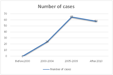 Source According to the search results of pkulaw.cn, the case data after 2010 shows: the case data after 2010 contains only the data from 2010 to 2014, but the case in 2015 only contains three cases before March 2015