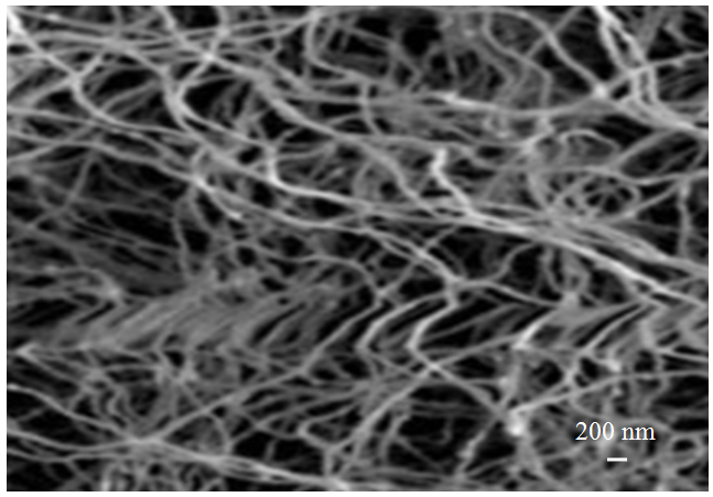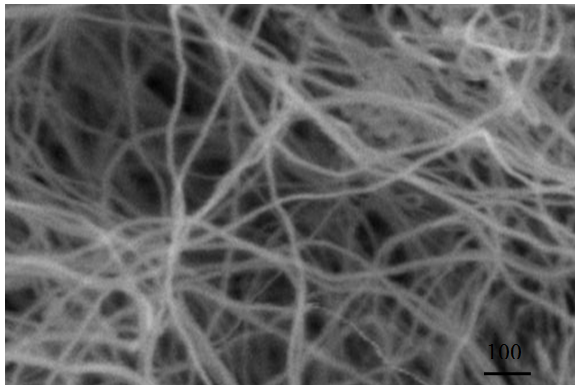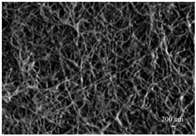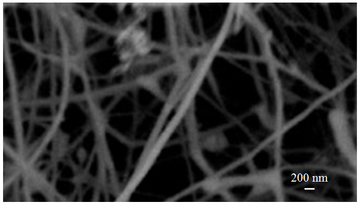 The silicon oxide layer of SiNWs serves as a protective layer rendering SiNWs relatively inert. The inertness of SiNWs is unfavorable for SiNWs applications. Thus, it is significant to improve the surface property of SiNWs to remove the oxide layer by HF etching. Figure 1 shows SEM image of SiNWs before surface engineering and HF-engineered SiNWs displays in Fig. 2. Results illustrate that upon etching with a dilute (5%) aqueous HF solution, new absorption bands attributable to Si-Hx (2000-2200 and ~900 cm-1) and CHx (2800-3000cm-1 due to organic impurities) are shown in the spectrum, while the Si-O absorption bands virtually disappear. Moreover, hydrogen desorption due to the trihydrides occurs at ~550 K and that due to the dihydrides occurs at ~650K. At or above 750 K, all silicon hydride species begin to desorb from the surfaces of SiNWs. At about 850 K, SiNWs surfaces are free of silicon hydride species. In addition, hydrogen-passivated surfaces of SiNWs show good stability in air (under ambient conditions) but relatively poor stability in water.23–26 The difference in the stabilities of hydrogen-passavited SiNWs in air versus in water may be associated with the hydroxide ion (even very low concentration in neutral solutions) in water because hydroxide ions can attack the silicon surface. The morphology of before surface engineering (Figure 1) changes considerably after etching with HF (Figure 2) and the diameter of the etched SiNWs reduces due to the removal of the outer oxide layer by HF engineering. Some Si nanoparticles form and absorp on the surface of SiNWs. Attributed to the sonication, the length of some SiNWs is shorted. These nanoparticles also increase the surface-to-volume ratio of after HF-engineered SiNWs.