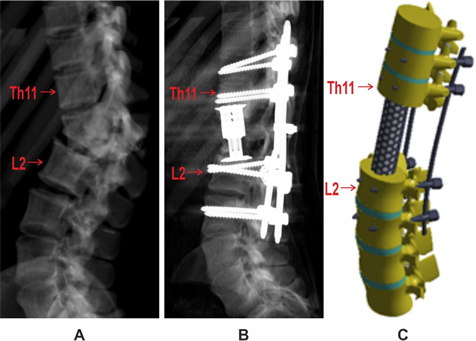 Figure 1 A - Preoperative radiography of patient M, B - Postoperative radiography following decompressive-stabilization surgery, C - External appearance of the finite element model.